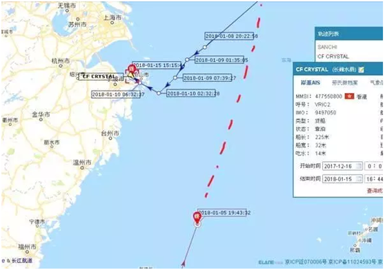 New clues!Although the collision time is 20 PM on January 6, but can find "SANCHI”on the last track, no more than 1 month at the latest 19:43 on January 5, the position is not far north of the Diaoyu islands.